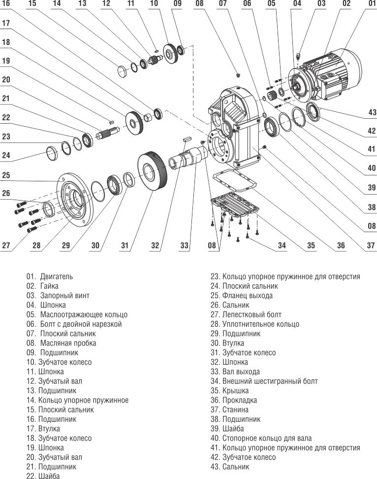 Корпус выполнен из чугуна. Редукторы поставляются уже заполненными минеральным трансмиссионным маслом класса вязкости ISO VG 460.