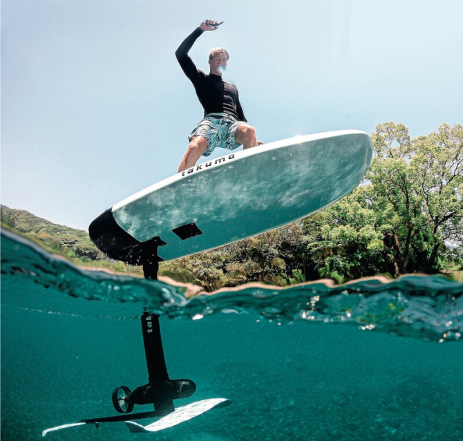 Подробнее: электрический гидрофойл состоит из доски, шверта с подводным крылом, электродвигателя, блока литиевых аккумуляторов. Беспроводной Bluetooth-пульт передает команды управления на доску. Батареи хватает на 1–1,5 часа катания.